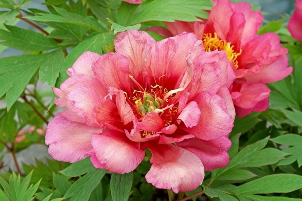 Paeonia intersectional ‘Hillary’ is a charming perennial prized for its large, fragrant double blooms in soft salmon-pink tones. The lush, light-green foliage enhances the beauty of the flowers, creating a fresh and elegant garden display. Growing to about 60 cm tall, this mid-season variety blooms abundantly from late spring to early summer. Exceptionally hardy and dependable, Hillary combines the best traits of herbaceous and tree peonies—offering strong growth, high productivity, and lasting beauty year after year. Perfect for gardens or cut flower use, it brings both color and fragrance to any setting.