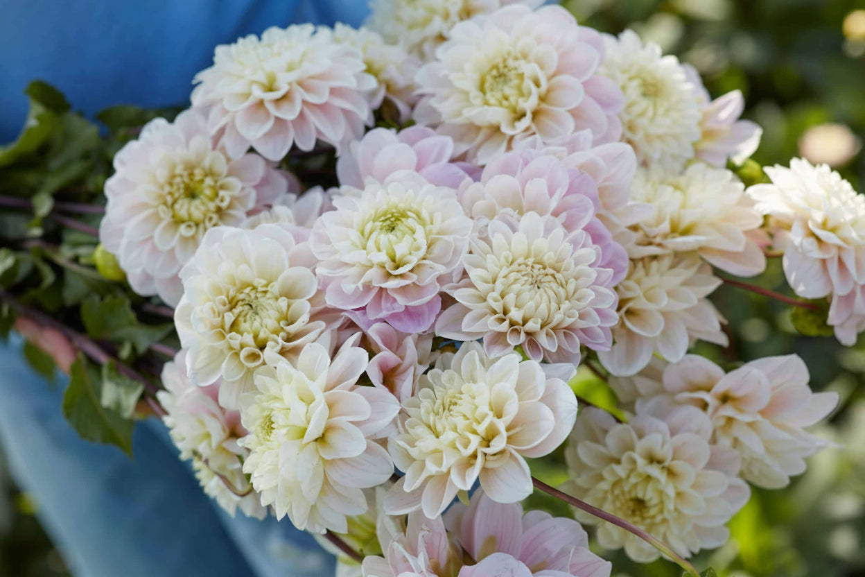 Sweet Nathalie may bloom in soft blush tones, but her presence is anything but delicate. This large, formal decorative dahlia features strong 5" blooms on exceptionally sturdy stems. Though she begins flowering later in the season, once she starts, she produces an abundance of blooms right up until frost. Plant height: 36"β40".